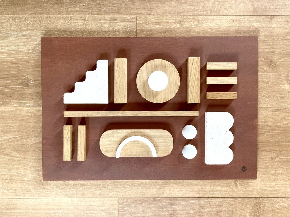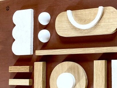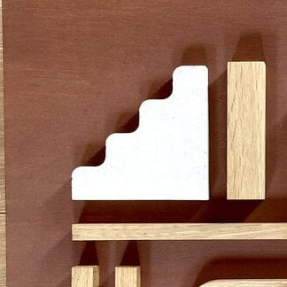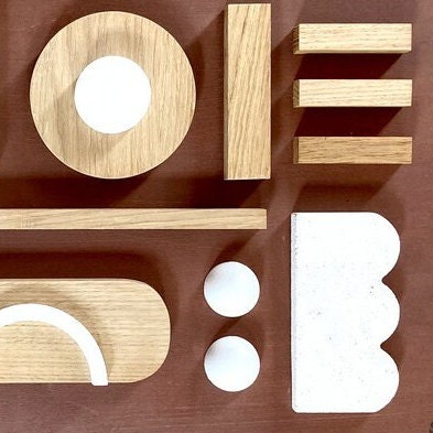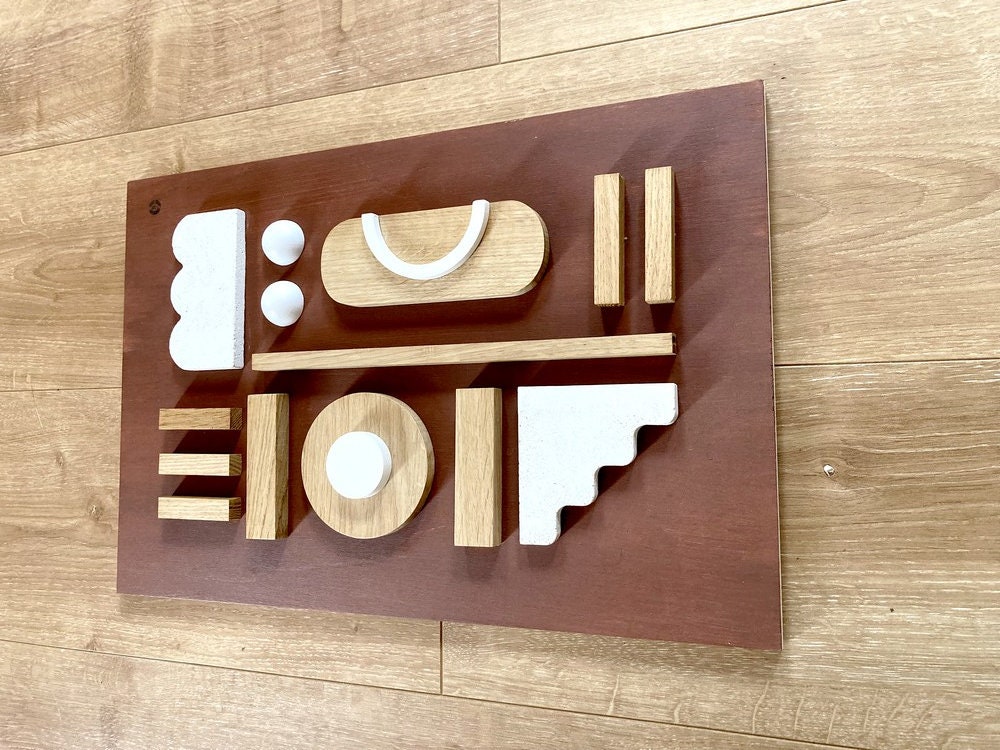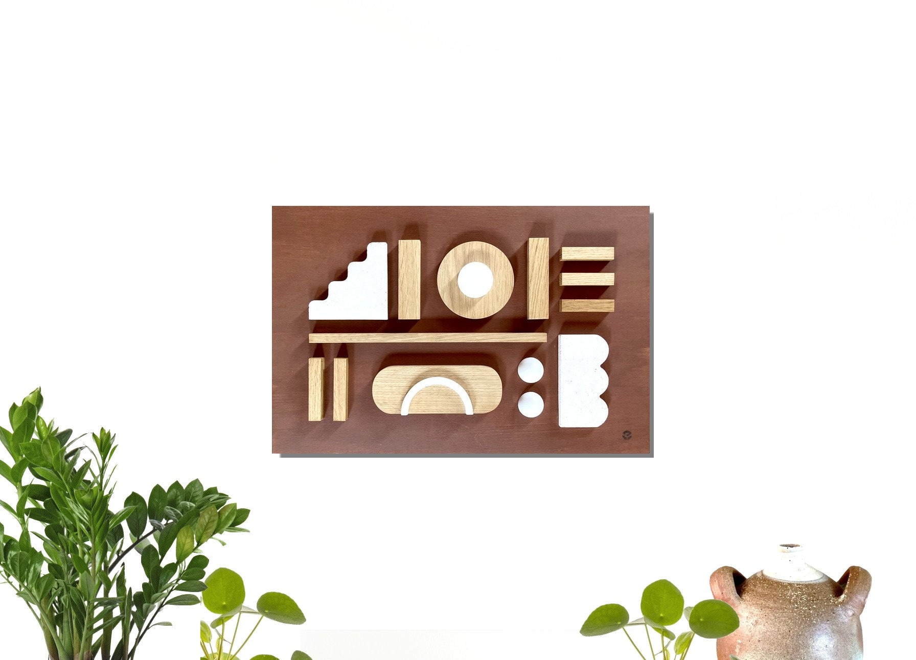 3D Painting - Relief wall sculpture - geometric wall decoration in natural oak wood, painted wood and white concrete.